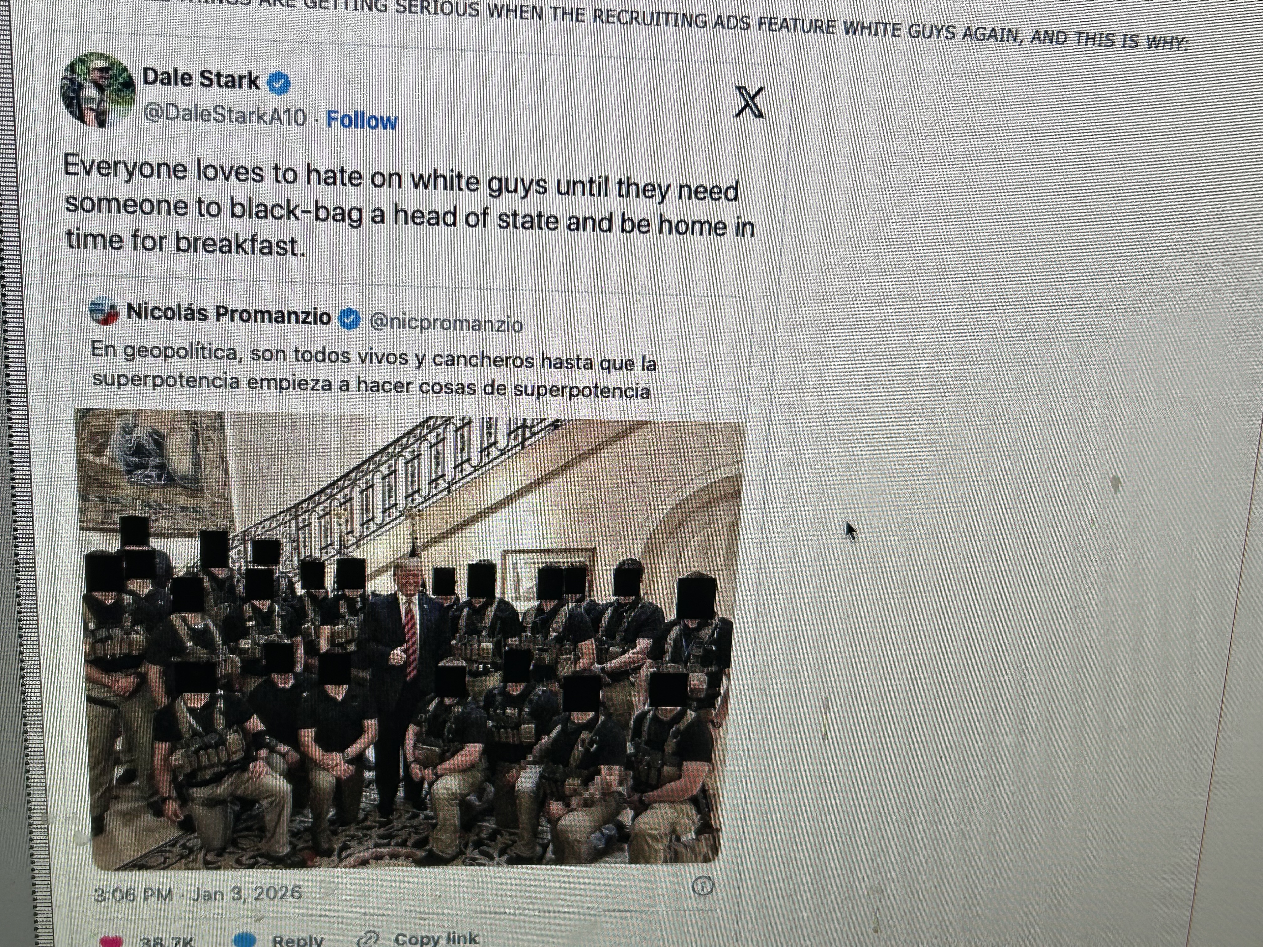 But if you are going out of your way to gloat about the performance of just White men than, yeah, great, go White men. The Venezuela Operation is all about White men.