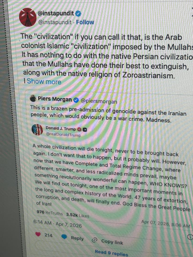 Well OK thanks. I guess but that has nothing to do with the point Piers Morgan was making. Trump is talking about destroying an entire civilization because they won’t do what he wants. Maybe Trump has a less deadly idea of what destroying a civilization is but my interpretation is that all the Iranian people would be dead along with all buildings and all infrastructure. There would just be a pile of rubble after the Tuesday deadline. This is what Trump is threatening. The distinction between Islamic and Persian here is meaningless. Islamic rubble and Persian rubble are pretty much the same thing. Rubble.